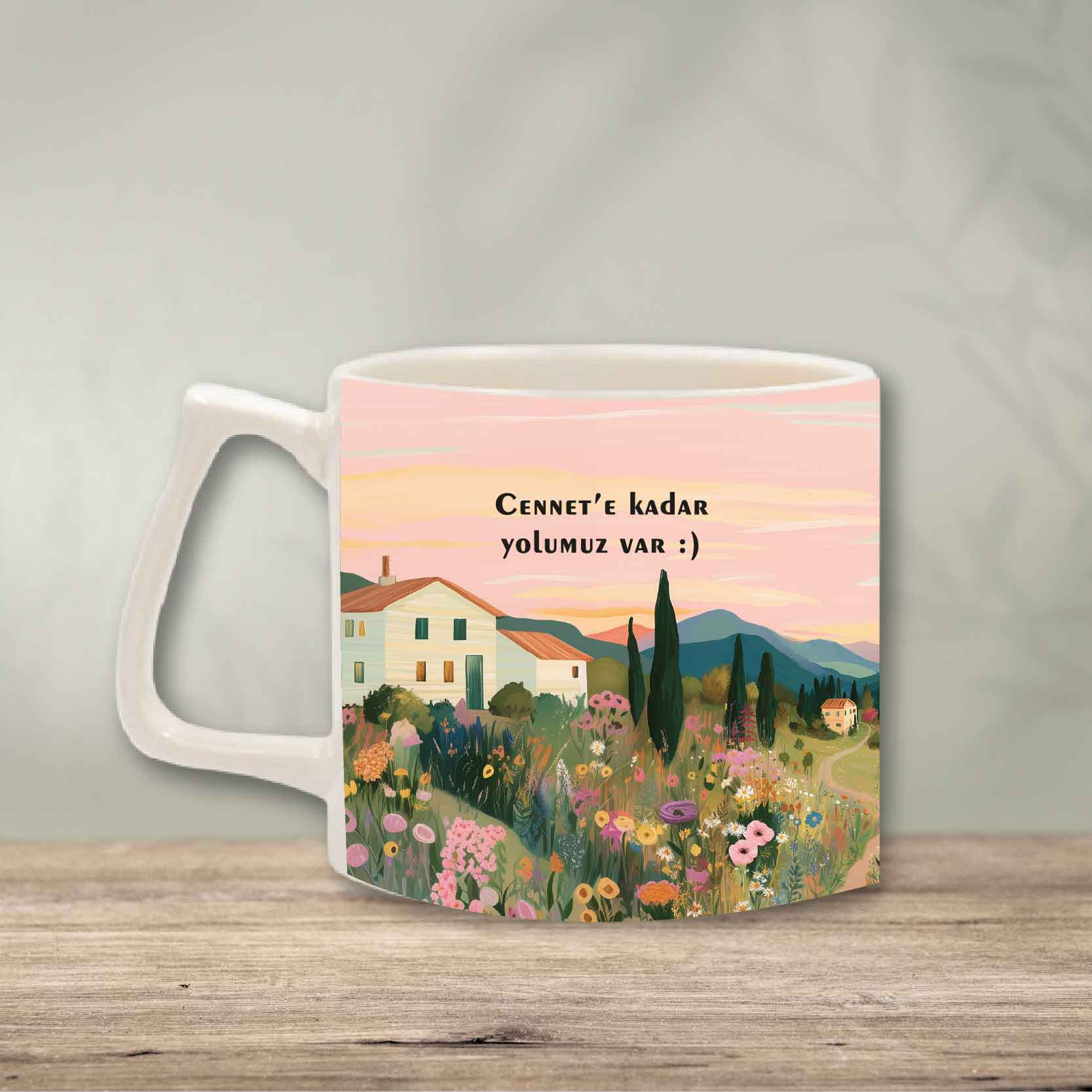 Üzerinde Cennet’e kadar yolumuz var yazılı minimal seramik kupa. Dilerseniz kendinize, dilerseniz sevdiklerinize hediye için rahatça tercih edebilirsiniz.